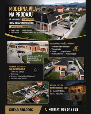 На продажу современная одноэтажная вилла в американском стиле с бассейном и двумя вспомогательными зданиями, а также с 2 гаражными местами и 3 парковочными местами на улице. Недвижимость находится на стадии отделки, расположена в тихом районе Доньи Кокоти, на окраине Подгорицы, рядом с реками Морача и Ситница, а также Британским посольством. Недалеко расположены многочисленные роскошные виллы. Ограждено с трех сторон бетонными стенами и с одной стороны проволочной оградой, из-за вида на большое оливковое дерево, с которым оно граничит (обеспечивая трехмерную перспективу с северной террасы). Здание было построено систематически, с высоким качеством и особым вниманием к деталям. Высококачественная металлоконструкция (система "4 Сезона"), выполненная компанией VHM Solutions из Германии. Большие стеклянные поверхности – изобилие естественного света. Чёрные плитки. Построено из термоблоков. Все бетонные поверхности (от нижней плиты до внешних входов и тротуаров) включали стальные волокна в дополнение к арматуре. Фасад занимает небольшую площадь, оставленную для реализации по вкусу и пожеланиям покупателя. Установки для теплового насоса, мульти-сплит-системы, пеллетного отопления и камина в гостиной. Установлена система умного дома. Установки видеонаблюдения. Тёплый пол. На заборе есть распределение на 4 метра и пространство, а также установки для генератора. Трубы были проложены в доме, гараже и на террасах, а также в подсобных помещениях. Интерьер полностью оштукатурен. Ландшафтные клумбы вокруг дома и на парковке (для них проведены водо- и электроснабжение). Атриум, в котором есть водо- и электроснабжение. При входе в виллу взгляд устремляется к атриуму, большому стеклянному пространству с освещенной оливковой деревом (согласно концепции дизайна). Забор с установленными сантехническими и электрическими системами. Грубо оштукатурено. Электричество и городская вода + колодец с исключительно напорной питьевой водой. Бассейн. Инфильтрационный колодец (3м) для бассейна, дождевой воды и других вод. Септик с исключительной ёмкостью. Большое количество гумусного, плодородного грунта для выравнивания и благоустройства двора оставлено для окончательной планировки. Местоположение предлагает идеальный баланс между уединением и близостью к городу – спокойная обстановка, природа и быстрый доступ ко всем необходимым удобствам. Идеально для тех, кто хочет роскошный дом, адаптированный под свои нужды, или высокодоходные инвестиции. Для получения дополнительной информации и организации экскурсии – свяжитесь с нами.